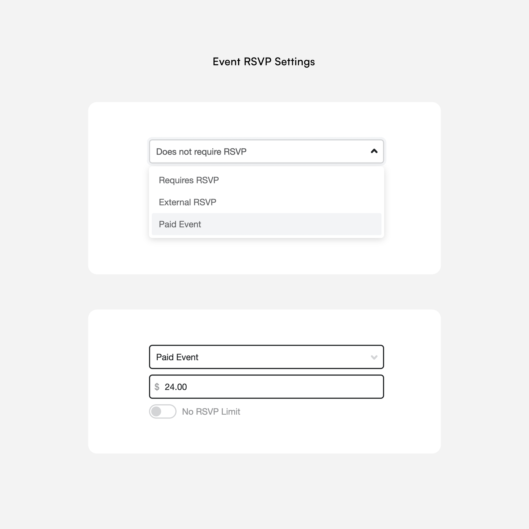 Selecting the Paid Event RSVP settings will then allow you to set a price and an RSVP limnit (optional).